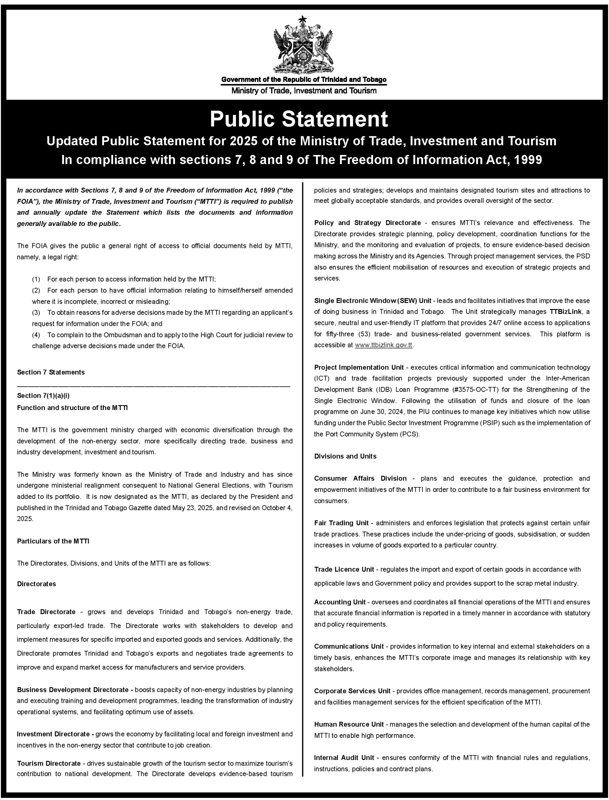 Updated Public Statement for 2025 of the Ministry of Trade, Investment and Tourism in Compliance with Sections 7, 8 and 9 of the Freedom of Information Act, 1999